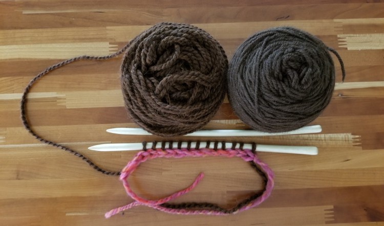 Switching between two yarns every three rows allows you to carry the working yarn up the side without having any loose ends to weave in. Sliding to the other end of the needle every six rows results in knitting on the back of the stitches, causing a flat “stockinette” look after that row for some variation in the pattern even though you are knitting every row. The exact size of the needles does not matter, as long as you like the outcome. If you use a larger needle than normal, your scarf will be lacier. The hand carved needles are a bit smaller than size 11, so they turned out well for the brown yarns I found in my stash.
