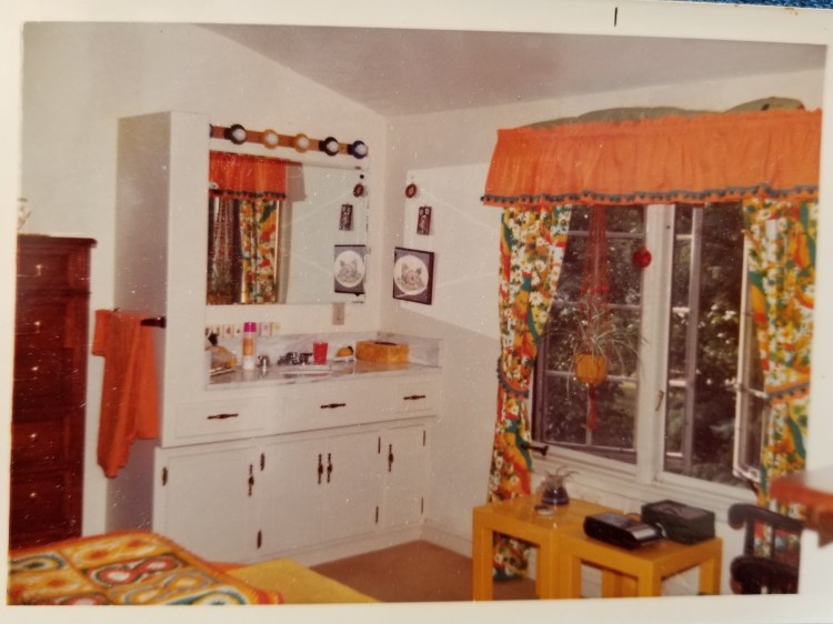 I believe I made the macrame plant holder that the spider plant is hanging in. Notice the cassette tape player on the little yellow table under the window. Occasionally I would listen to the radio, and then quickly hit “record” if a good song came on. LOL. I have no memory of the stuffed animal snake on top of the curtain rod.