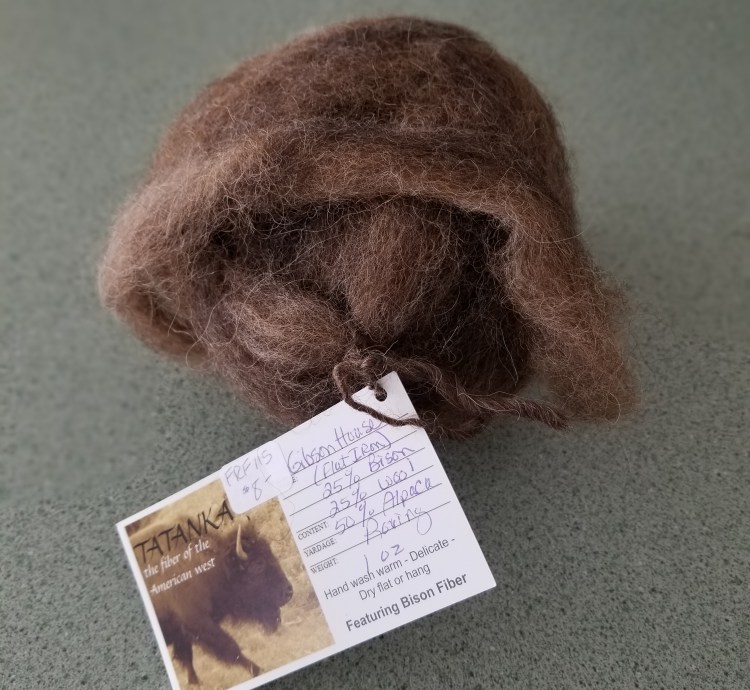 I bought a bag of bison fiber blended with wool and alpaca last fall in South Dakota, at the same time as the 100% bison fiber I wrote about in a recent blog post. It was only one ounce but was more expensive due to being blended with the other fibers, and already prepared for spinning. Since it was taking some time to card the 100% bison fiber, I decided to go ahead and spin the blended fiber.