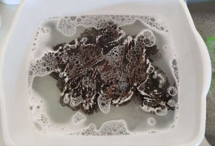 It is always best to wash yarn after being spun in order to “set the twist”, so the fibers “remember” their new twisted condition. This involves filling a tub with lukewarm water, adding a squirt of dish soap, and gently pushing the yarn into the water until it is completely wet. After soaking for about 10 minutes, another bowl or tub of clean water is prepared and the yarn transferred to that. After two or three rinses in this fashion the yarn is squeezed in a clean towel and hung to dry. The key is not to use water that is too hot and not to agitate the yarn, or it will start to felt.