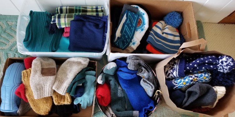We had an entire trunk full of random extra hats, mittens and scarves from our old house. My parents also had baskets and plastic bins of extra winter gear. I dumped all of it on the living floor and sorted it all out. A few items in bad shape were tossed out, some organized for keeping on hand. Two entire grocery bags full were donated to the “Welcome Center” in Pelican Rapids, MN, where they were given directly to people who needed them.