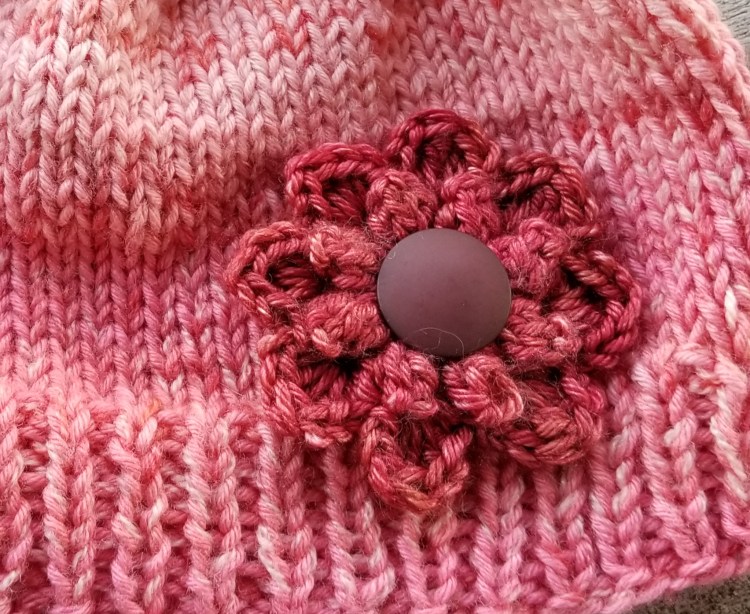 I had the idea of adding buttons, tassels, or pompoms. I found some scraps of yarn in my stash that worked for each hat, then stopped at Tangles to Treasures in Fergus Falls to look at my large collection of Mary Turak buttons, and to consult with Torri. Torri suggested crocheting flowers to adorn the hats, which could have a button in the center. Bingo.