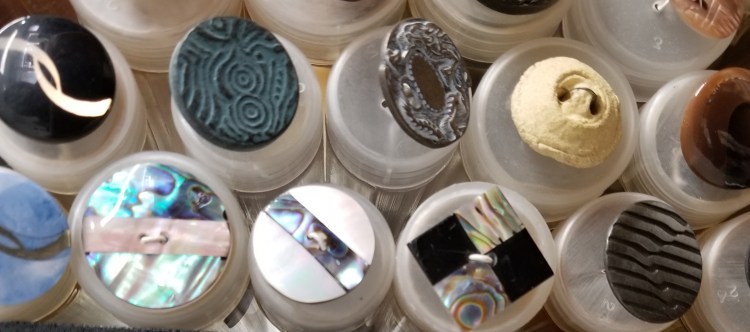The button collection came with my Mary Turak yarn store inventory purchase in the fall of 2018. Many of them are cool vintage buttons from the 1960’s. Each unique design of button lives in a plastic tube as seen in the photo below. Some of the tubes have only one button, others have many. The tubes pack horizontally into display cubes so you can see the sample button attached to the top of each one.