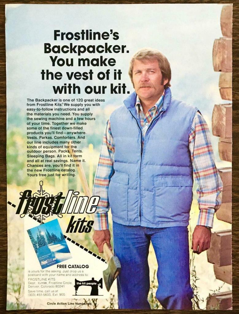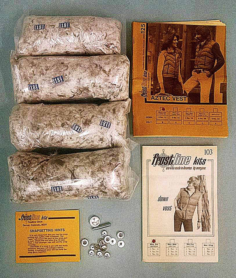 Does anyone remember Frostline Kits from the 1970’s and 1980’s? That was a company selling kits with fabric, 100% goose down filling, and accessories for sewing outdoor clothing and equipment, including down vests and jackets, backpacks and tents.