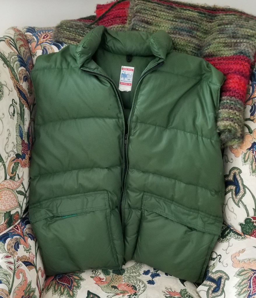 I found an advertisement online from 1978 with a photo of the same style of down vest as the green one above. The model in the photo is looking rugged and about to chop some wood in his vest.
