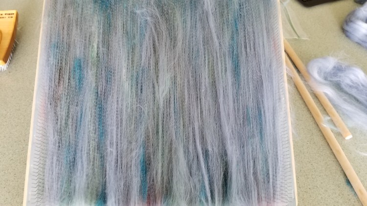 My hands got scratched up in the process of “pasting” the fiber on to the board. I did not see any references to this on the videos I watched. To get the fiber off the blending board and into a rolag, you wrap the fiber around two dowels starting at the bottom. Rather than lifting it all off in one big roll, you are supposed to lift it and pull part of it off on to the dowel, then start again to get more. I got too much fiber on the first rolag, and then it all started to come off the board before I got it rolled on the dowel. I had to start over brushing some of the fiber back onto the blending board, so the last rolag is thinner and blended differently.
