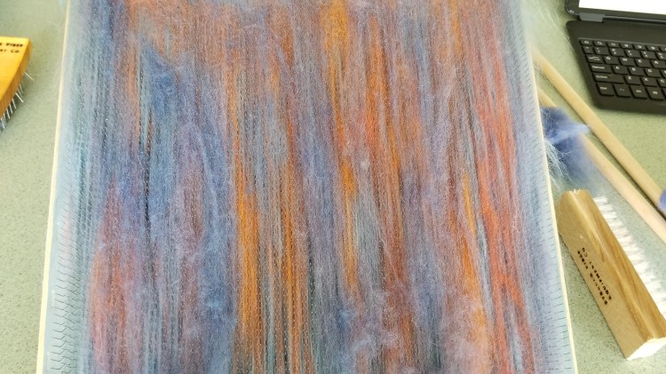 I bought myself a blending board for Mother’s Day, which seems like ages ago. A blending board is another tool for preparing fiber for spinning. The main thing it does is make “rolags”, which are rolled up spirals of fiber for spinning. You can also make batts with the blending board. Ironically, one thing it does not do well is “blend” different fibers together. A drum carder works more efficiently for making larger batts and for thoroughly blending fibers together.