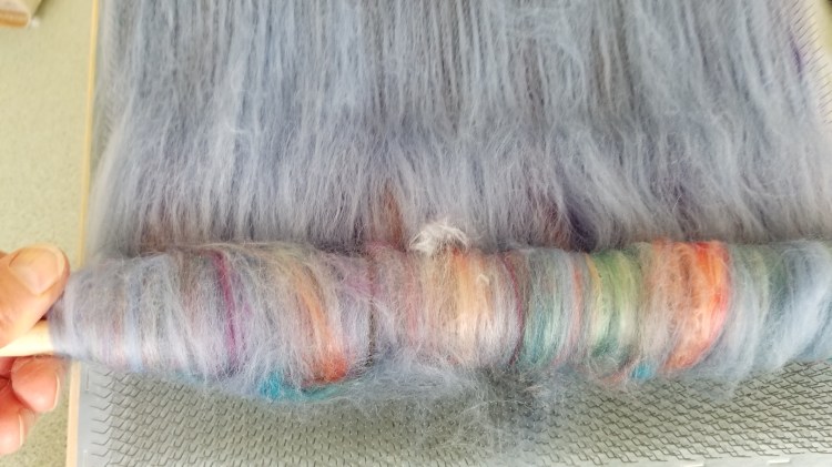 I decided to just go for it without measuring or having a plan. I had watched a couple of you tube videos to learn how to use the blending board, so I knew the basics. I started applying some of the blue wool first, and them some of the alpaca and angora rabbit. You just swipe some on, dragging down so it spreads out, rather than being lumpy. A special brush is used to compact the fiber down so you have room to add more, or you can use a paintbrush. It took some practice to figure how much fiber to add on each layer, and to feel comfortable with the technique so that it came out evenly. It does not have to be even, it can be any way you like it. But I find it easier to spin if the fiber is somewhat evenly distributed, rather than having thick blobs here and there.