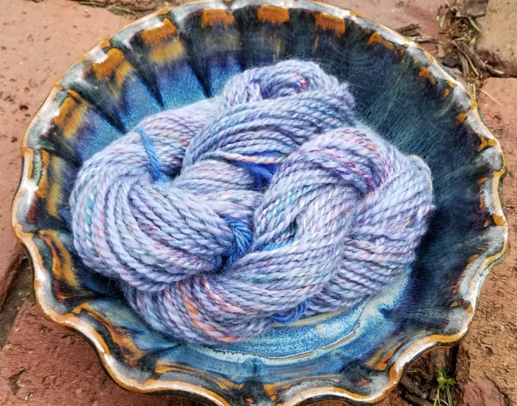 The final result was a small skein of yarn. It is not really big enough to make anything, but it looks very pretty sitting in a ceramic bowl.