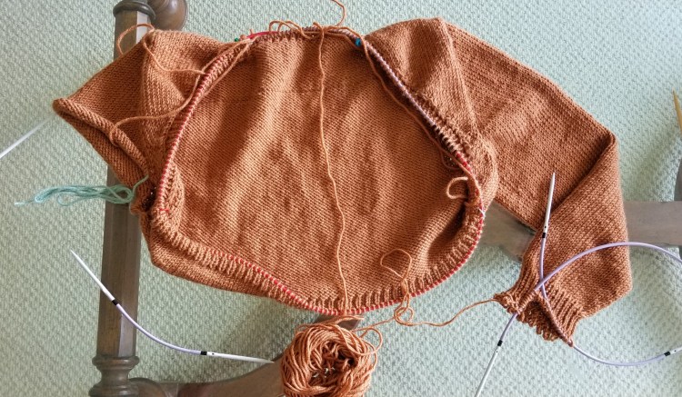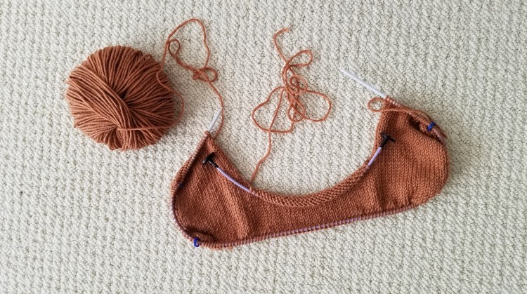 The following photo shows the progress with stitches picked up on the sides, and about an inch of ribbing knitted around the back, sides and neck. The ball of yarn I was using ran out, so I decided to work on the sleeves instead. Starting on one sleeve, I replaced the waste yarn that was holding the stitches with double pointed needles and picked up some stitches under the arm, according to the instructions. The sleeves will be knit in the round, so no seam will be needed. Yay.
