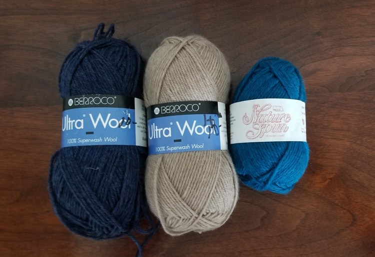 Daniel picked the scarf option with three different wool yarns. He started out with some navy and turquoise, but there was not enough of the turquoise, so he picked some tan also.