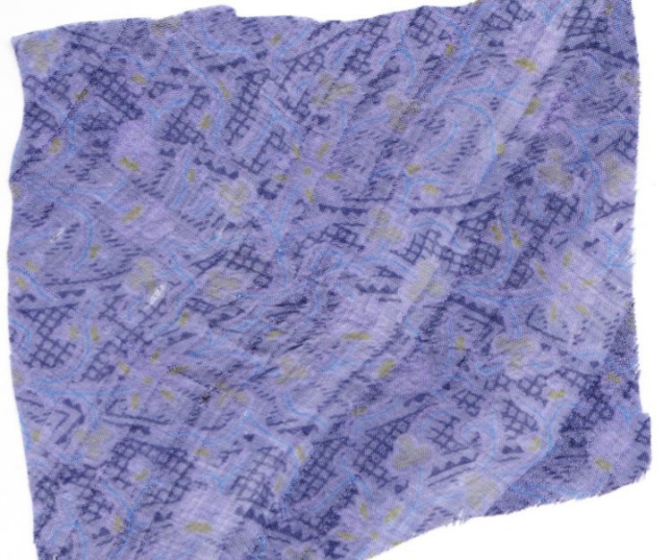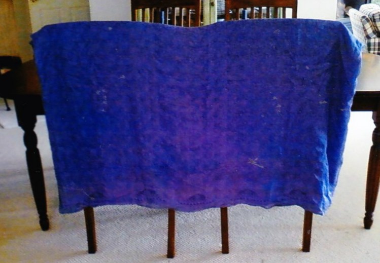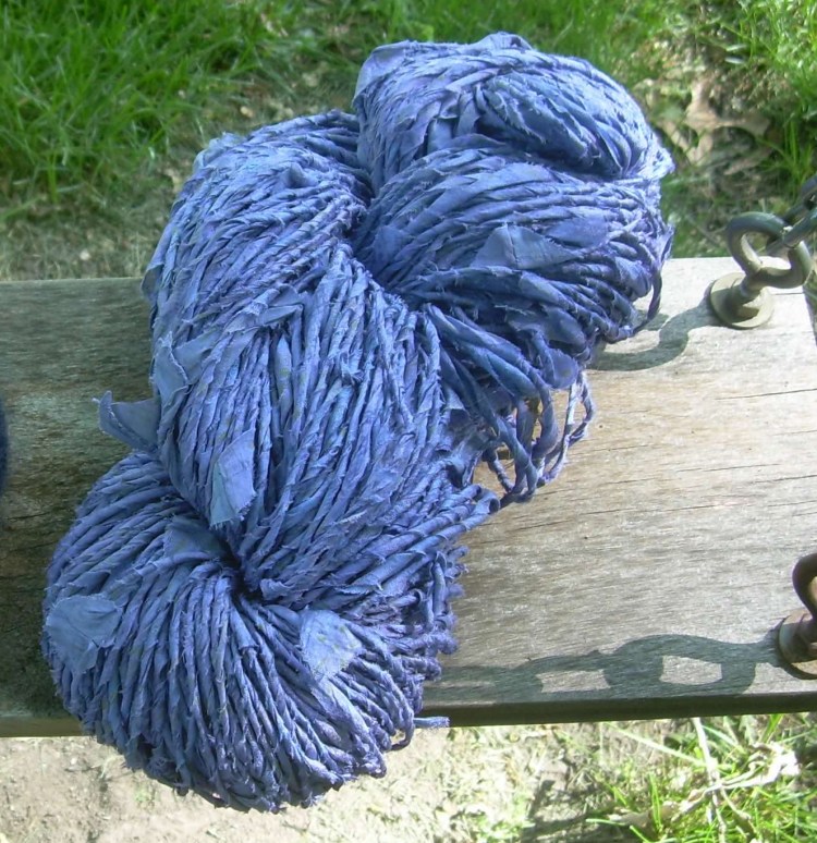 At Shepherds Harvest in 2010 I bought a recycled Silk Sari. The vendor had a large selection of old saris that could now be repurposed into something else. She was demonstrating how to fold and cut a sari into diagonal narrow strips for spinning into sari silk yarn. It was hard to decide which sari to buy, but I purchased one in a beautiful periwinkle color.