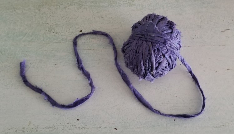 The next photo shows the resulting yarn. There are little flaps of fabric poking out at the places where there was a seam in the bias strip. The fabric could be trimmed down so it does not stand out so much at the seams, but I thought it was a fun look.
