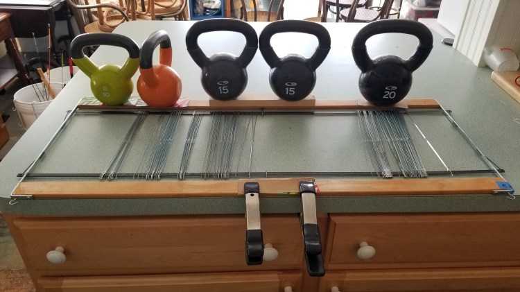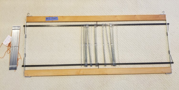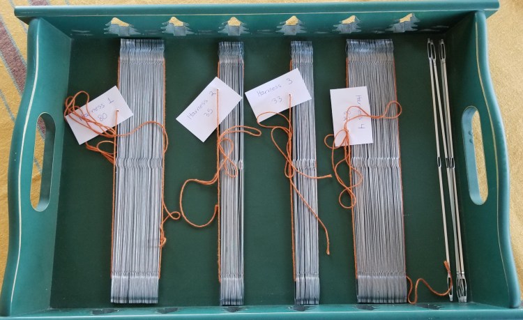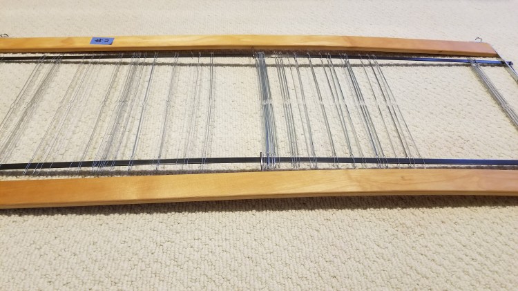 It was a process to count, sort and arrange the heddles so they would be ready to put back on the loom harnesses. I should have taken a photo of the slippery heddles while I was in the process of organizing them. I did not figure out right away that they have a top and bottom. The “eye” where you put the yarn through has an angle so they catch on each other but which also allows them to be lined up perfectly if you can get and keep them in order. After some frustration and bad words, I came up with a system to string up the correct number of heddles in the right direction so that each harness would have a total of 150. I laid them out on a tray until I was ready to add them to the harnesses.