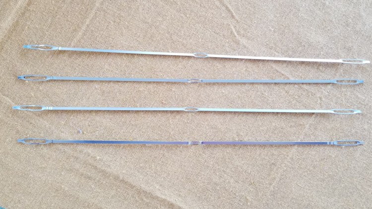My loom was also missing some of the heddles, the wires attached to the harnesses that warp yarns are threaded through to make patterns. A new loom like mine comes with 600 heddles, or 150 for each of the four harnesses. My loom had 370 total heddles which were not distributed evenly across the harnesses. When we were on vacation in Tennessee last fall I bought a hand woven towel that I want to reproduce at home. I would need 400 heddles to make a towel of the same density, with 100 on each harness. In talking to Torri at Tangles to Treasures about options for buying additional heddles, she remembered that she had some stashed away in a storage area. It turned out she had the actual missing heddles from my loom that a previous owner had removed. They were in a compact bundle that did not look like enough, but it turned out there were exactly the right number to end up with a total of 600, plus four extra.