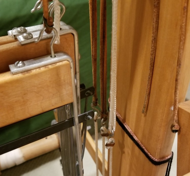 While I was in the middle of weaving my second project on the loom last fall, one of the leather harness cords broke apart. There are four harnesses (a wooden frame) that hold the heddles (wires with holes to thread yarn through). Cords hold and connect the harnesses to the pedals, so they can move up and down to create patterns. One of the other original leather cords had already been replaced by some Texsolv, a special type of nylon cord made in Sweden, so it must have broken before I got the loom.