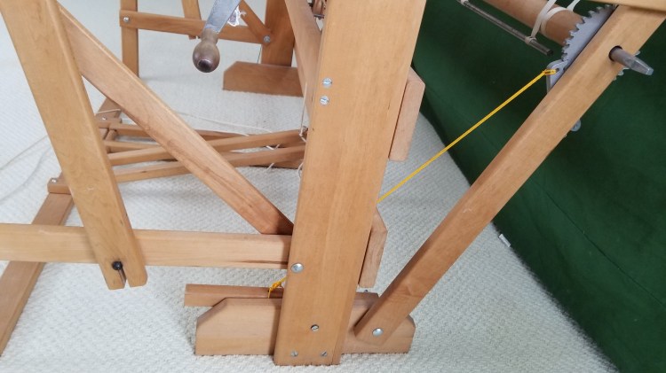 In the following photo you can see some gold cord which is connecting the back ratchet brake to the foot pedal that controls it. That was clearly not the original cord so I wanted to replace it with something white to match the other cords used on the loom.