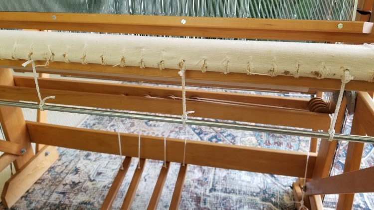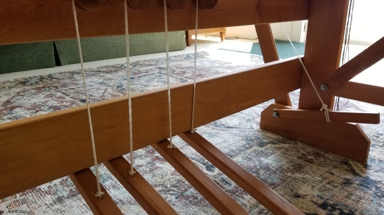 The last thing I did to update up my loom was replace the cord connecting the front apron bar to the front apron fabric. It was functional but slid around a lot and I didn’t like it. I had some leftover Texsolv so I cut five pieces, put fray check on the ends to keep them from raveling, and put them on at even intervals instead of the continuous piece of cord that had been used. There is a trick to putting the end through one of the regularly spaced slots in the Texsolv, or bending a piece of it through a slot in the cord to attach it instead of tying a knot. The next three photos show the way I got the loom, the Texsolv pieces cut and ready, and the new Texsolv on the loom.
