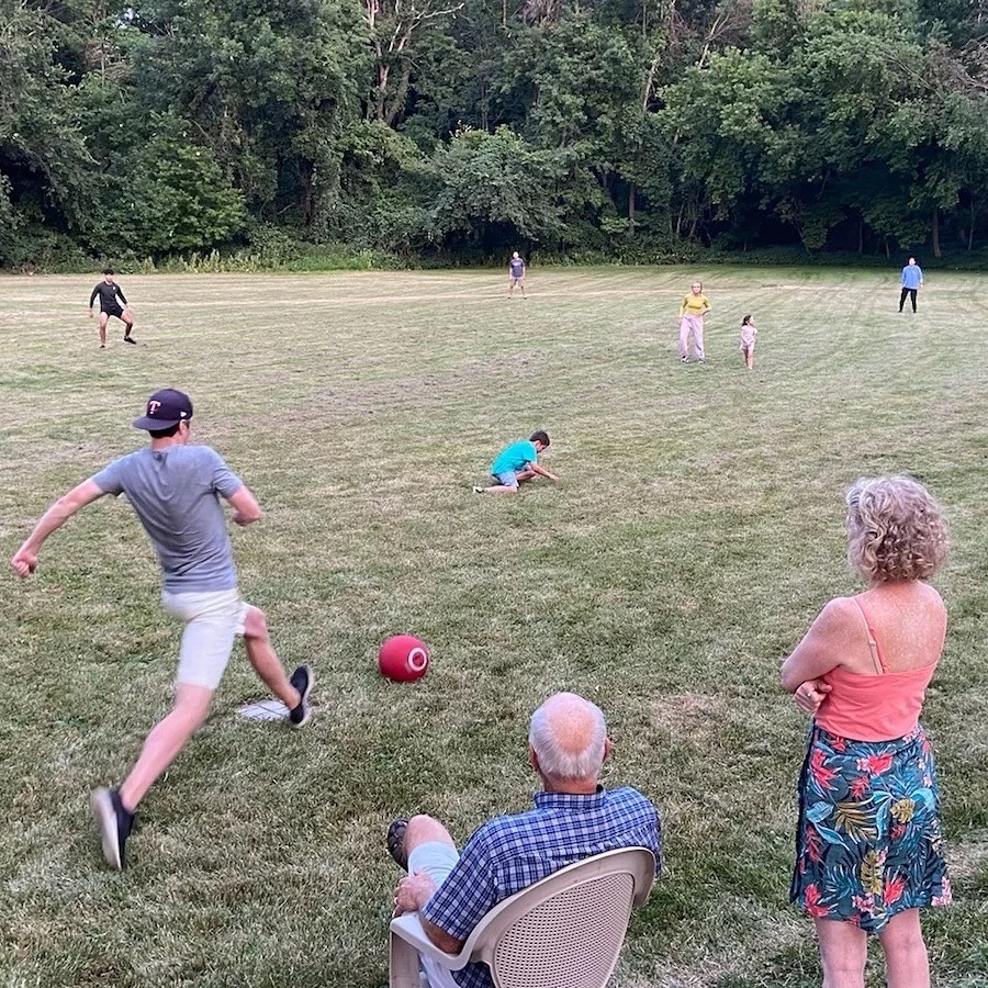 We have this reunion every summer, although most of the time it is smaller. The pizza dinner happens every year, there are always additional large group meals, everyone looks forward to watching or playing kickball and the bike ride with pancake breakfast. The next photo is from an earlier year, with my son about the kick the ball.