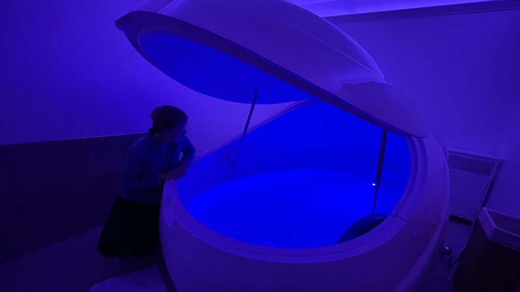 Another activity we did was go to Reboot Float and Cryo Spa where our daughter works. We are not normally “spa” kind of people, but we decided to try the float tank. Normally it costs about $60 to $100, but we got the “parents” price of “free”. Our son James also tried it. There are “pods” with warm water and tons of salt. The large amount of salt causes you to float. You lay in the pod for about an hour with music and light on or off as you choose. You do not have to close the lid, but most people do. You are supposed to get completely relaxed and in a state of sensory deprivation. I thought it would be claustrophobic with the lid closed, but it wasn’t. There was a sort of optical illusion so it felt like you were in a bigger space. Wayne loved it and would do this regularly if money were no object. My son and I were both glad we tried it, but are not interested in doing it again.
