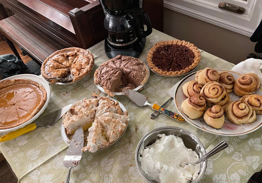 We had five pies for Thanksgiving, with several people contributing their labor. My daughter made her first apple pie, using apples from the neighbor’s tree. My niece made pumpkin pie. Gayle’s cousin was asked to bring a pecan pie but instead brought home made cinnamon rolls. That is not traditional but oh well. We bought a pecan pie from the freezer section of the grocery store instead, since the freshly made pies were sold out on the day we went shopping.