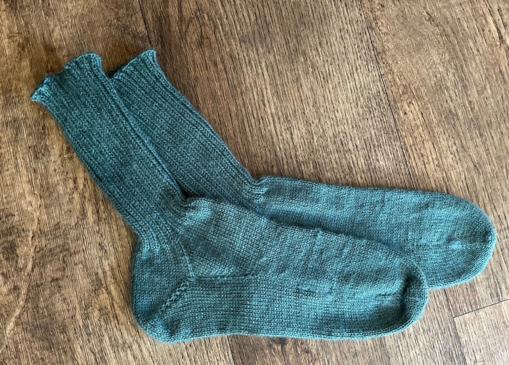 This yarn is very soft and fuzzy. It also split regularly and pills a lot. The socks are a little bigger and looser than the Up North Yarn socks. I should have done a sample with a size 1 needle. The fact that the yarn label suggested size 2 or 3 needle threw me off. That is why you are supposed to knit a swatch. Despite all that the finished green socks looked pretty good after laying out flat to dry.