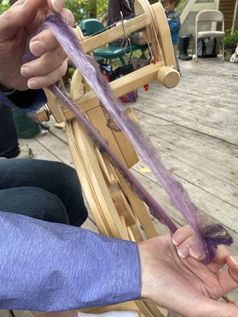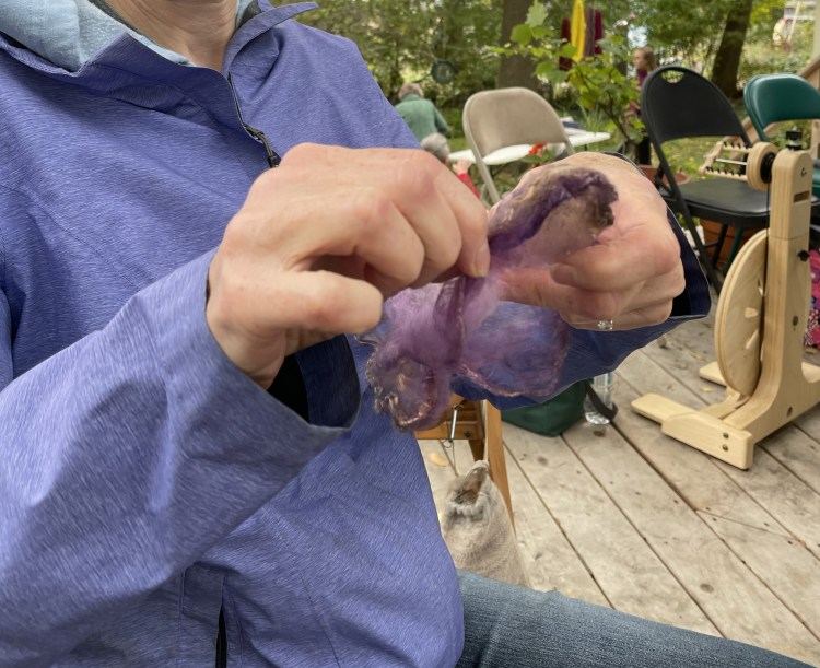 I worked on spinning the silk hankies at Fall Fiber Day at Northcroft Farm in Pelican Rapids, Minnesota. To spin a hankie, a layer (or more then one) is separated from the rest, a hole is poked in the middle, and then it is stretched out until it is the width desired for your yarn. The silk can be knit like that, but I wanted to spin it.