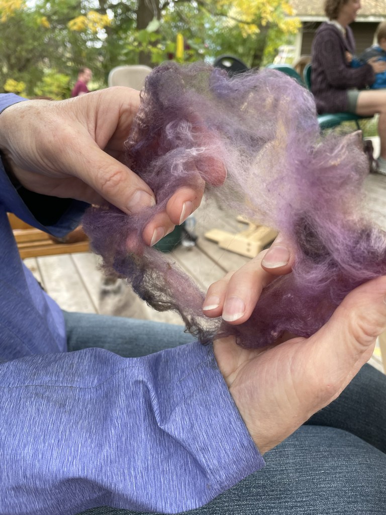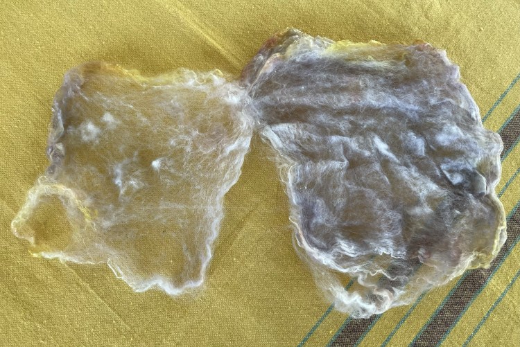 I also bought some hand dyed silk hankies. One silk hankie is actual silk from a silk cocoon flattened out into a very thin square. They are usually sold in layers of multiple hankies hand dyed together. I bought two “stacks” of hankies in different colorways. One was darker with purple and some blues and greens and a bit of yellow. The other one was lighter with some purple and more yellow and lighter blues. I thought the two colorways looked good together. I was planning on spinning them into yarn, but they can also be used in felting projects. To use the silk hankies a single layer, or a couple of layers, are separated from the rest. Following is a photo of the two stacks of silk hankies I bought, along with one layer from the lighter colorway stretched out ready to spin.