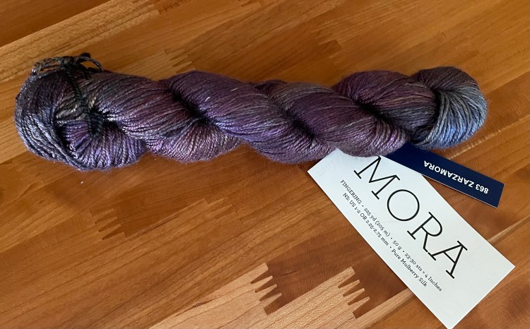 After circling around the large room twice to check out all the offerings and watch some demonstrations, I decided on two things to buy. I fell in love with some silk/wool/linen blend Malabrigo yarn in a muted dark purple shade. I didn’t know what I would do with it at the time, but being only one skein it would likely be part of a project with multiple yarns.