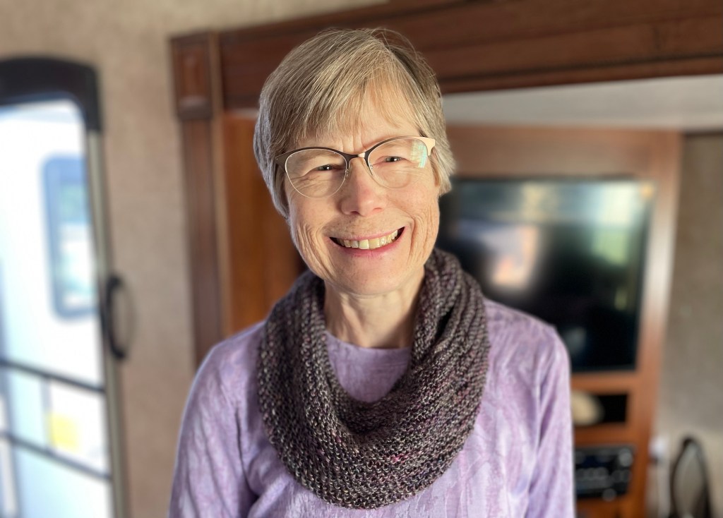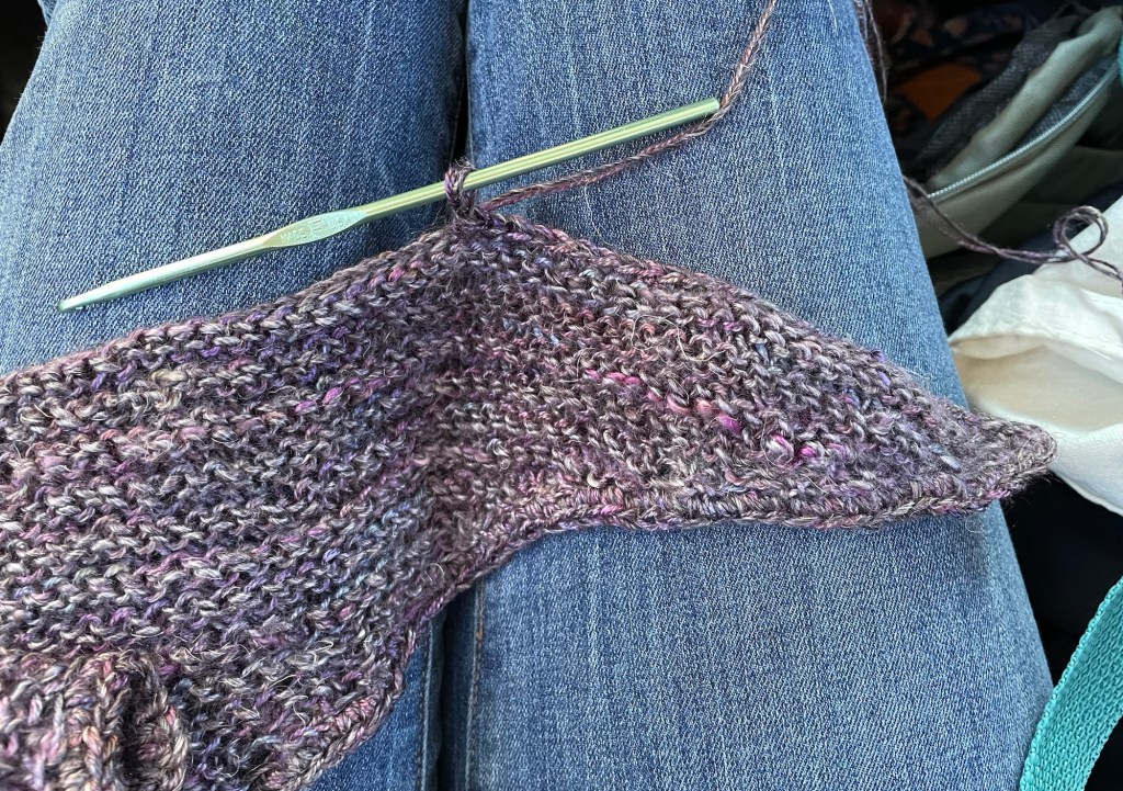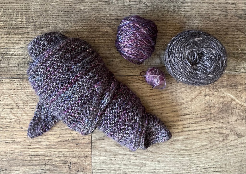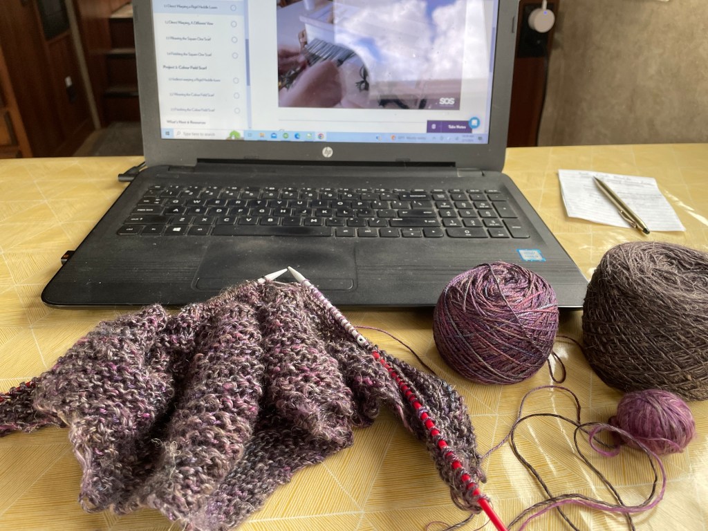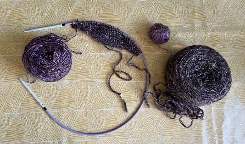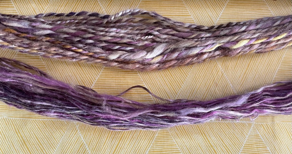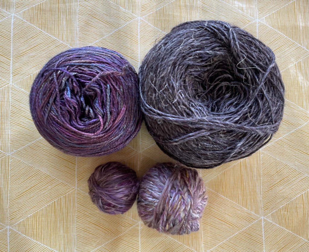 While here in Arizona I did an excellent virtual School of Sweet Georgia class on spinning (click here to check it out). Even though I do not have my spinning wheel here, I learned a lot, including a couple of ways of plying that can be done with one length of singles yarn (as opposed to my usual method of having two bobbins). If I had had that information when I was still at home with my spinning wheel, I might have plied that extra length of dark purple singles into two play yarn. When I get back home I plan to watch the School of Sweet Georgia spinning class again when I can practice on my spinning wheel what is being presented.