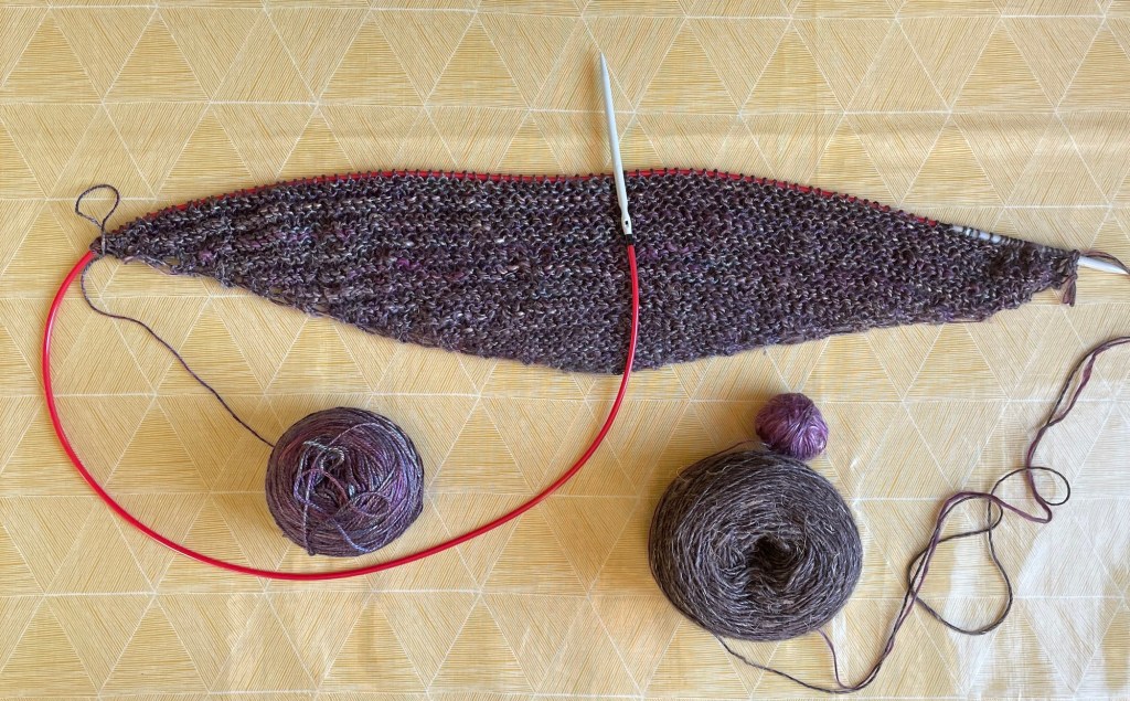 I assembled the purplish merino, linen and silk yarns that I wanted to use in the project, including the two Malabrigo yarns and the small amount of the silk hankie singles that I had spun. I did not use the plied silk hankie yarn. I followed the shallow triangle pattern with the increases at the end of every row, but also alternated between two yarns every row, sliding the yarn when needed. I held the silk hankie singles yarn together with the darker merino/linen/silk yarn for the first yarn, and used the 100% silk Malabrigo yarn for the second yarn.