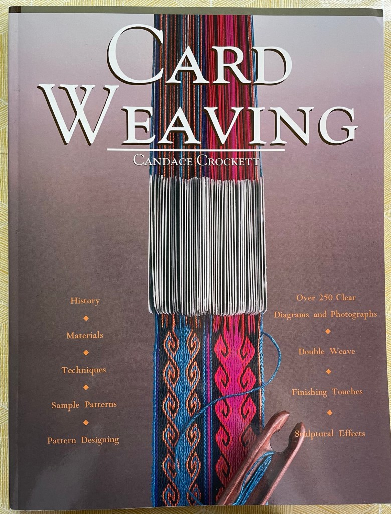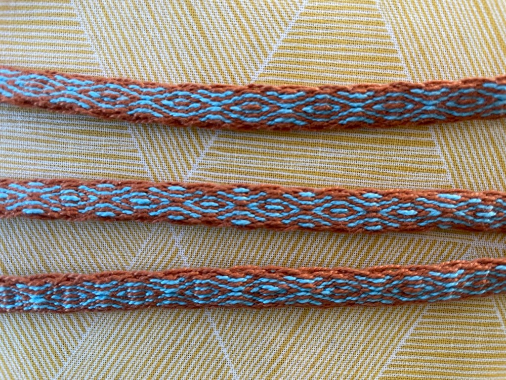 The weaving is warp faced, which means that the pattern you see is all warp yarn, other than at the sides. You actually cannot see the weft yarn at all except at the edges. The pattern is formed by the warp yarns getting twisted around each other as the cards are turned forwards or backwards. The weaving is very dense so when you have to start a new length of weft yarn you can overlap it in the same shed, and then just cut off the ends even with the edge. This is great as I do not enjoy weaving in ends.