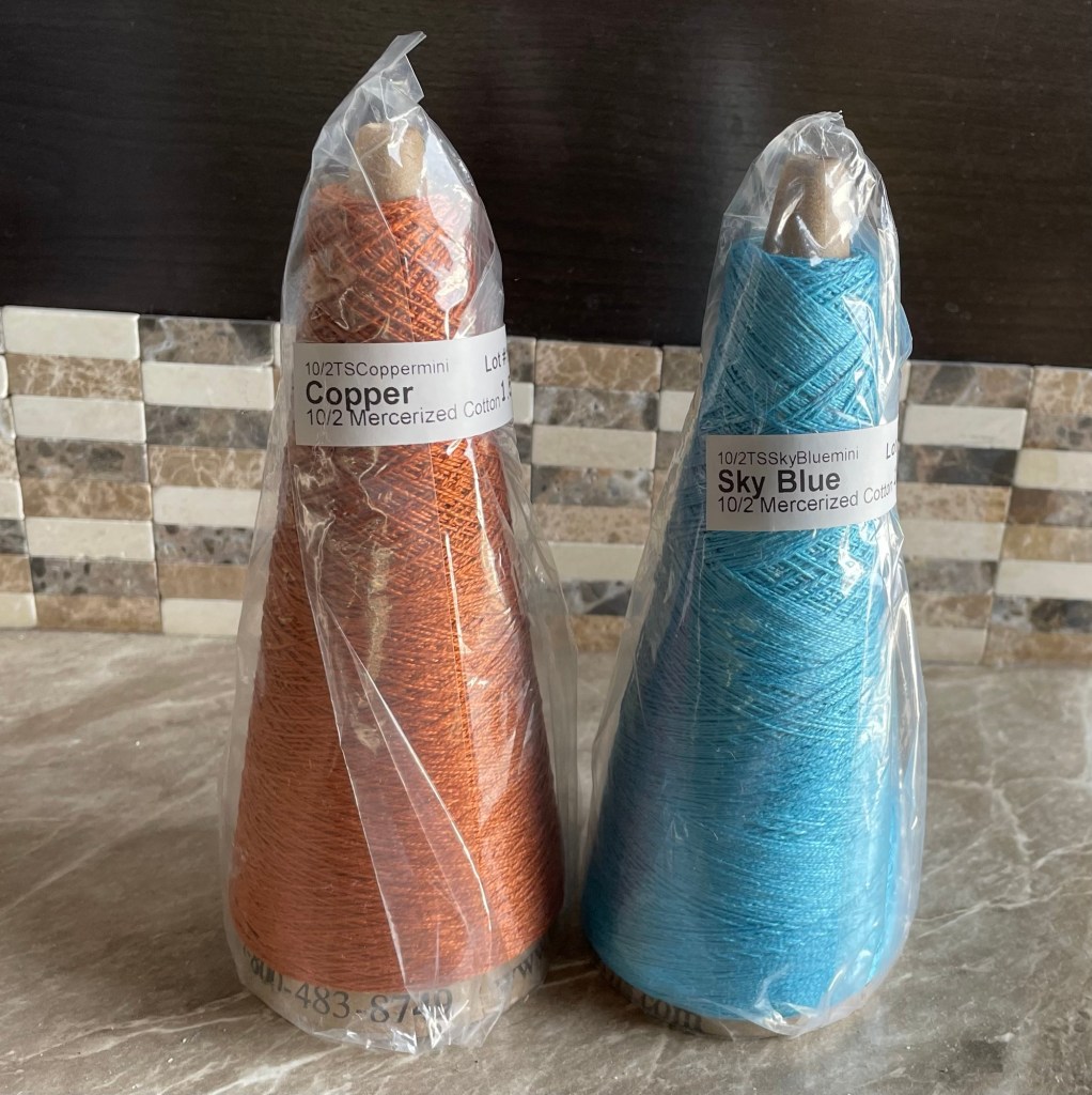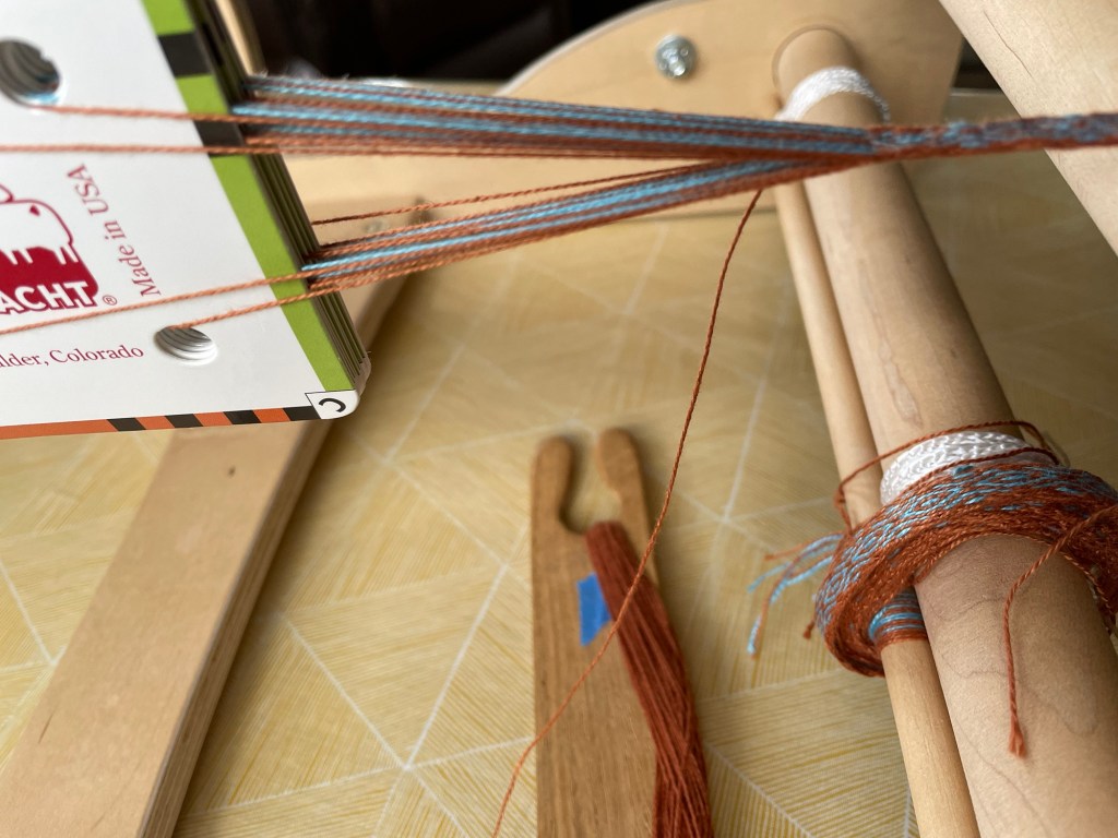 After weaving the sample, I felt comfortable what I was doing. For the real shoelaces project I had two colors of 10/2 mercerized cotton in 1.5 ounce cones from Lunatic Fringe Yarns. Most of the places where I saw this yarn sold it only came in larger quantities, so I was happy to find these smaller cones. I had measured out the yarn for one pair of shoelaces at home, and packed it in with my supplies for Arizona.