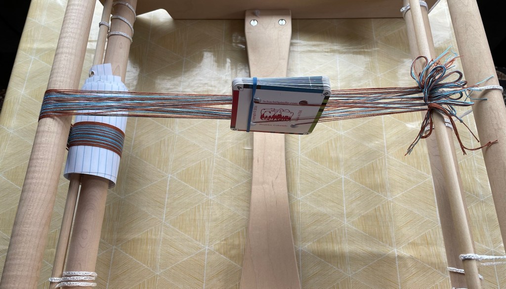 I started this adventure with a practice project using 30″ long waste warp yarn ends from my cottolin towels project (click here for that post), so I could figure out how it works before beginning the shoelaces. After threading the yarn ends through the cards I tied one end on to a ring and made a knot in the other end, to prepare for weaving using the backstrap method.