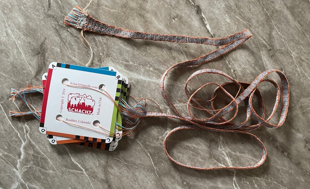 Weaving shoelaces is like knitting socks one at a time. After finishing the first shoelace, I had to start over and make the other one. I wonder if you could make two at a time. The second one went faster and came out a bit longer at 67″.