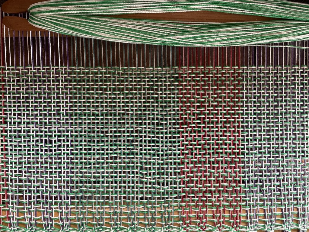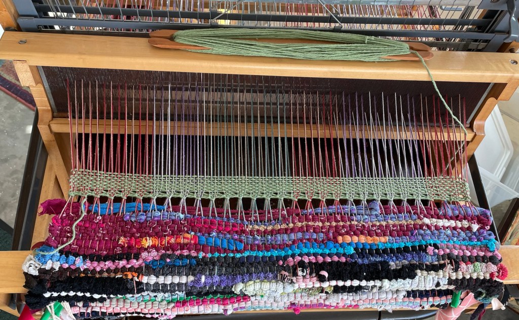I found a couple of options for weft yarn in my stash. For my first attempt at weaving on this loom I chose some green Peaches & Creme 100% cotton yarn. It is not nearly as thick as the rug “yarn”, but it seemed like it would work. I wove a couple of rows, packing them close together, which resulted in a “weft faced” look where the weft yarn is dominant, like the rug.