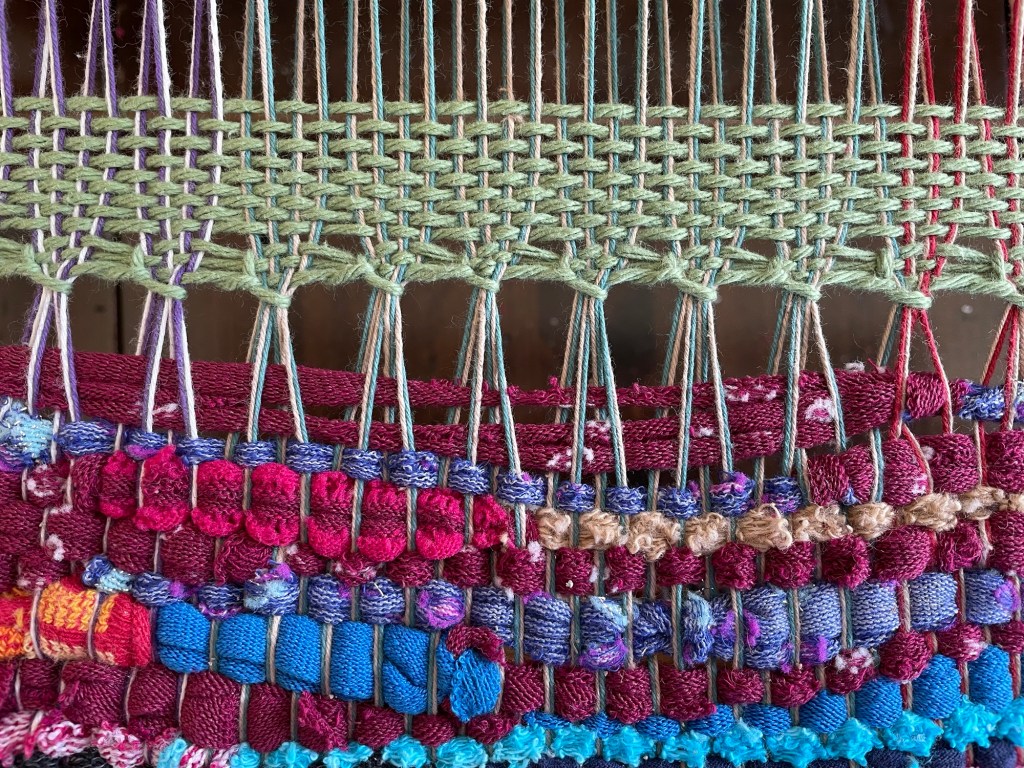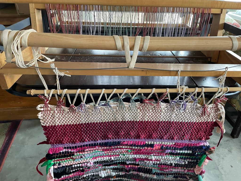 It looks like the person who started this rug was also experimenting with different warp yarns. There are some rows of two different colors of some kind of flat shiny “yarn”, followed by a couple of rows of purple worsted weight cotton (something like Peaches & Creme yarn), followed by the thick stretchy rag rug “yarn”.