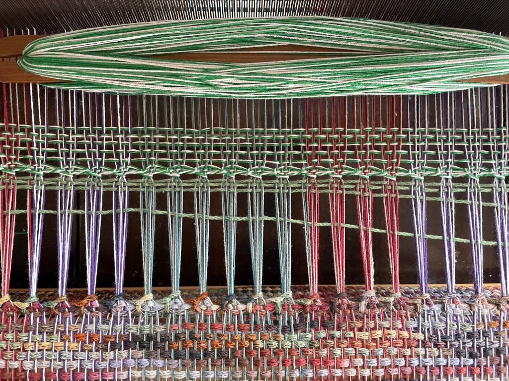 After I ran out of the Berroco yarn I wove with two strands together of 8/4 cotton, one green and one white, which I believe is about the same thickness as the warp yarn. It is quite open, although it will shrink some when I wash it.