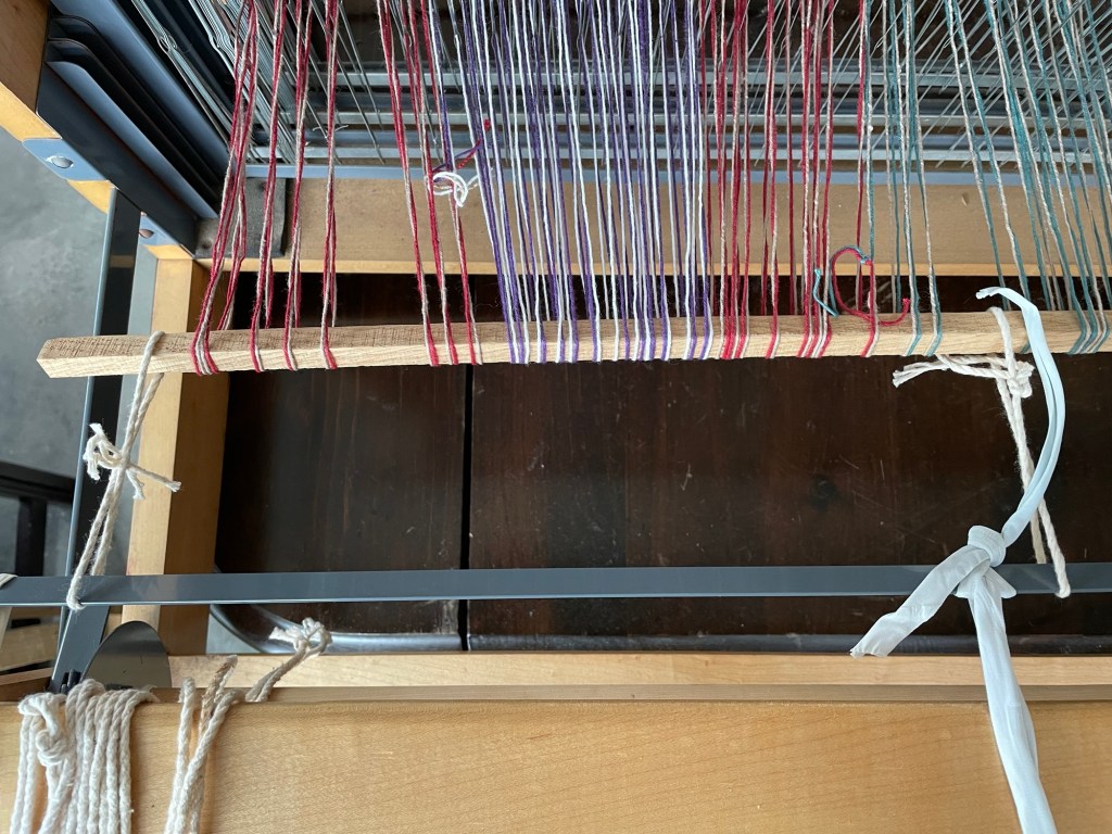 The yarn warped on the loom is something like 8/4 rug warp cotton, and not threaded through every slot in the reed. Instead there are two yarn ends together in a slot, followed by two empty slots. The weft “yarn” for the rug is a series of stretchy strips of fabric joined in a chain. The large space between warp yarns is needed for the thick rug weft “yarn”.