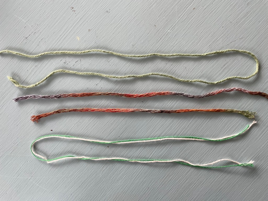 Following is a closeup photo of the three different weft yarns I tried (Peaches & Creme cotton, Berroco cotton/polyester, two strands of 8/4 cotton).