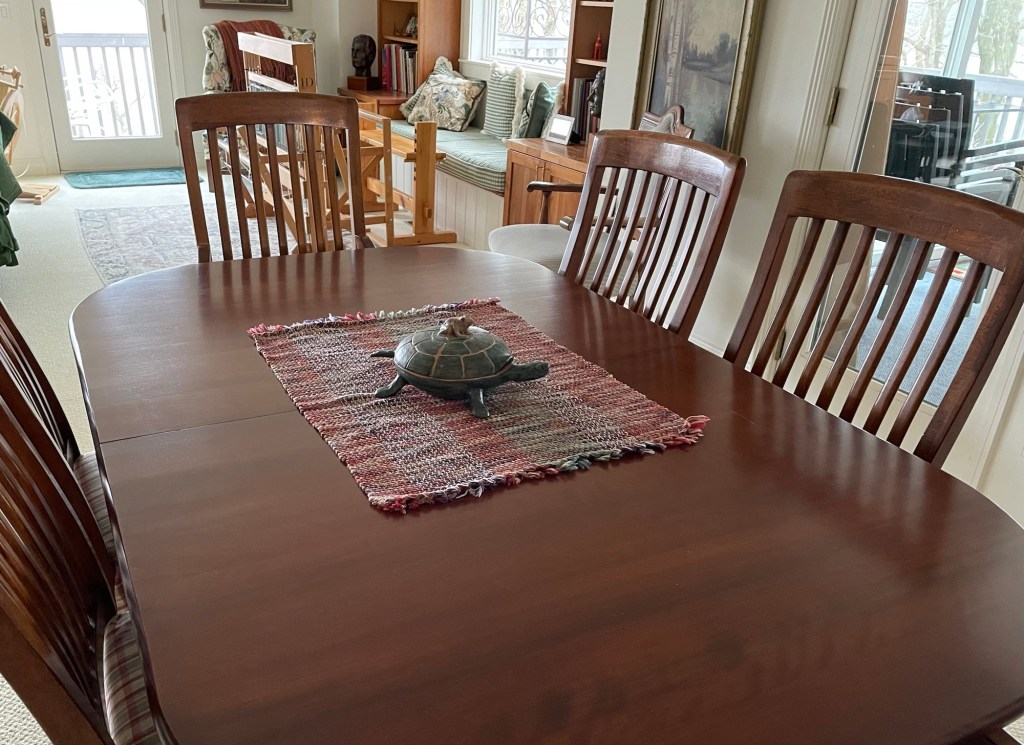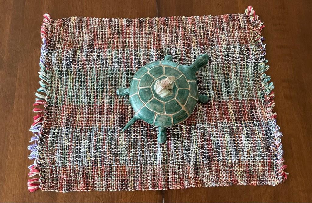 I was not expecting to have any usable final product from weaving off the rest of the warp yarn that came on this vintage loom. However I did end up a table runner of sorts, and a string bag! The section woven with the Berroco weft yarn works as a runner on my dining room table, adorned with the ceramic turtle bowl and lid that my mom made. My four harness floor loom is in the background waiting for another project.