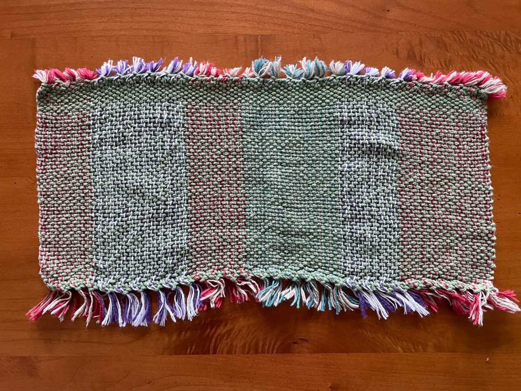 I wove in the loose ends and washed the individual sections of weaving (except for the rug at the beginning). As expected, they shrunk some, ending up with a slightly more dense weave, but still on the loose side. I think the large section of all 8/4 cotton could be used as a towel.