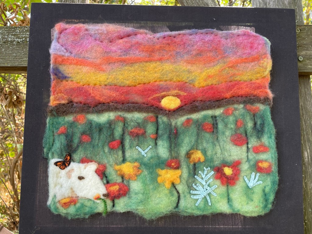Whatever the weather, I love seeing so many colors and textures, and different ways people are using fiber for art and functional products at Fiber Day. I don’t know who made this beautiful needle felted “painting” that was set up on an easel in the yard.