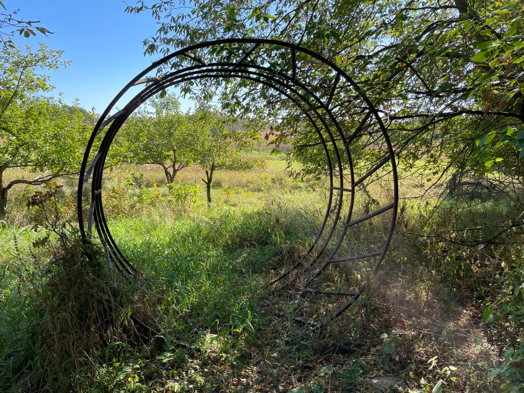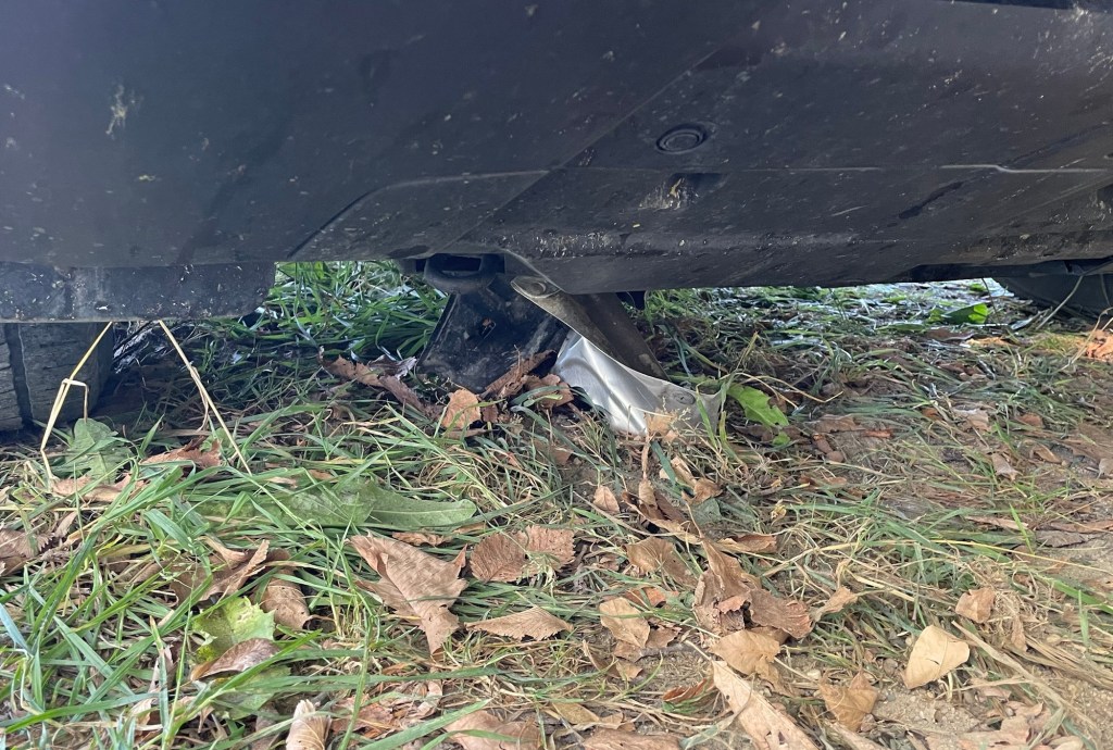 At the end of the afternoon I went to get my car from where it was parked in a field down the long driveway. As I started to drive the car toward the house to load up all the stuff we had brought with us, there was a terrible scraping noise. It turned out there was a big mangled piece of metal hanging off the underside of the car near the front. I was worried that I was going to have to call AAA, and have Wayne come and get us. I backed up so I was not blocking the driveway and walked back to the house to consult with Dave Ellison. Dave figured out that a “heat shield” had come loose, and he was able to unscrew what was left of it and get it off. He assured me there was no problem driving the car without the heat shield. We agreed that it must have already been loose before it caught on something when I drove the car on the field.