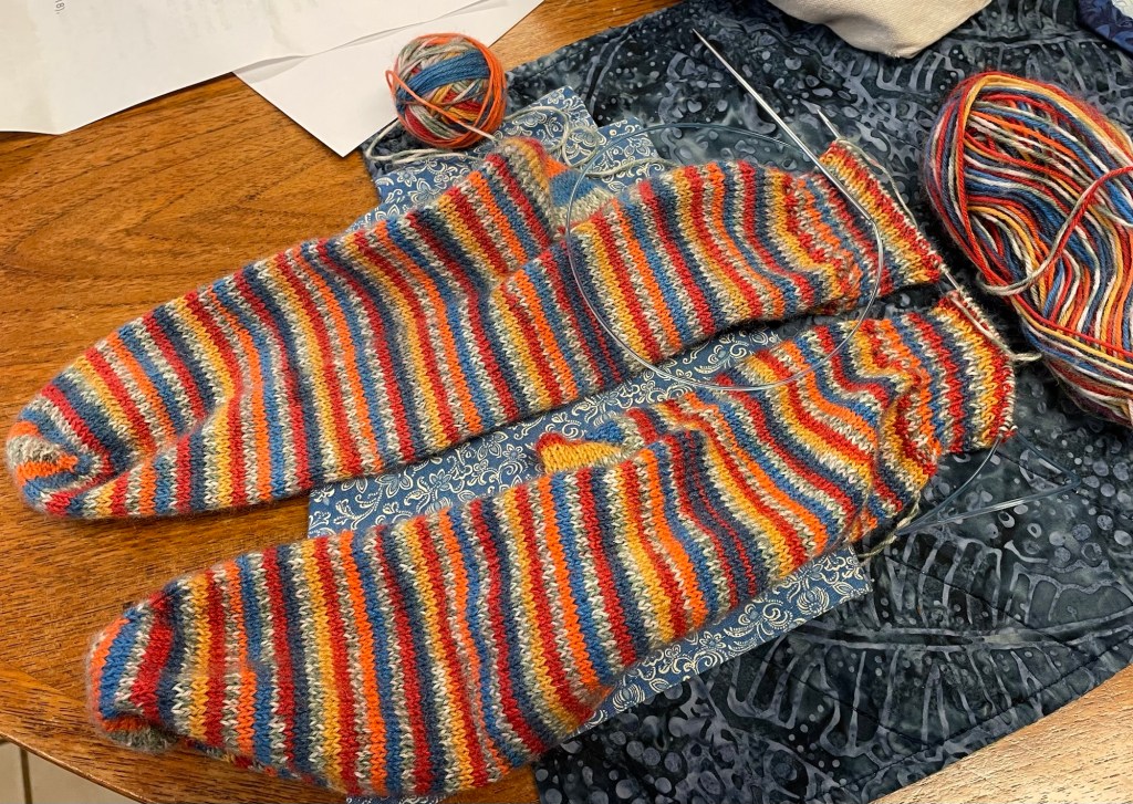 I am so close to finishing this pair of self striping socks for my son. Just a few more rows of cuff to go.