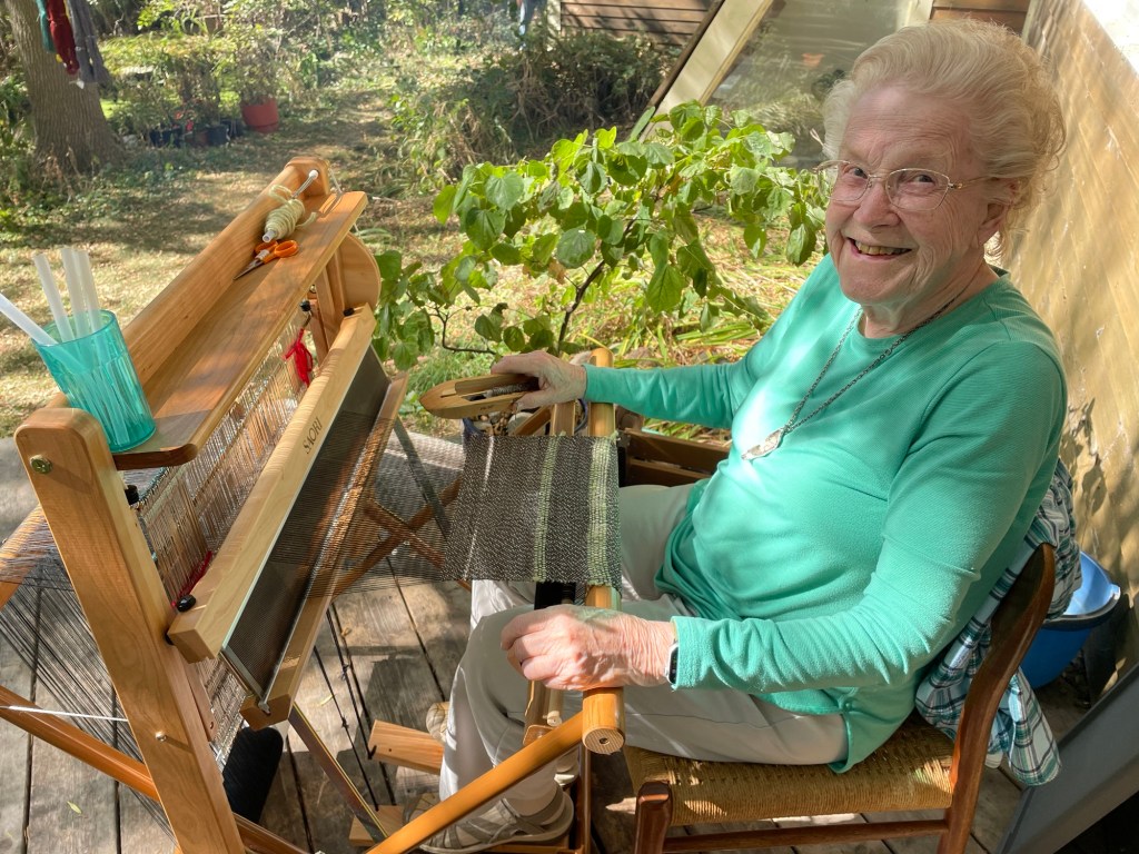 Grandma Alice, age late 90’s, was working at her Saori weaving loom on the deck. Saori looms are sort of a cross between a rigid heddle loom and a floor loom with two shafts, designed for free form art projects. Grandma Alice was working on a pretty plain weave scarf.