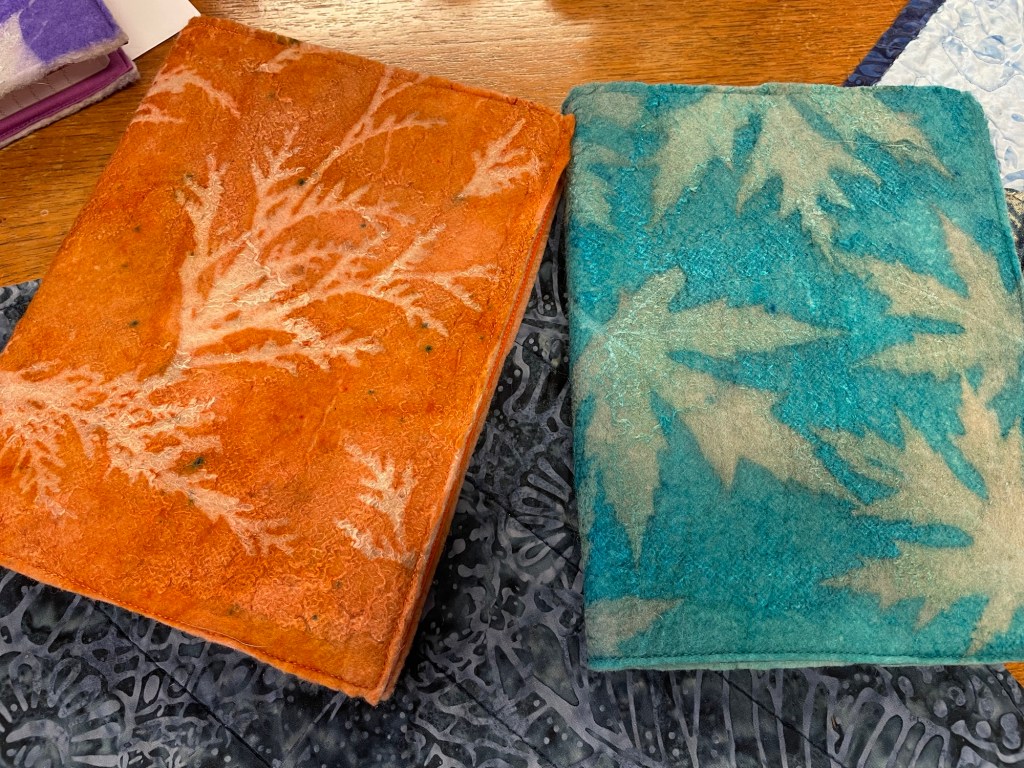 Someone brought these felted notebook covers for show and tell at Fiber Day. I don’t know how they got the leaf designs on, but they are so pretty!
