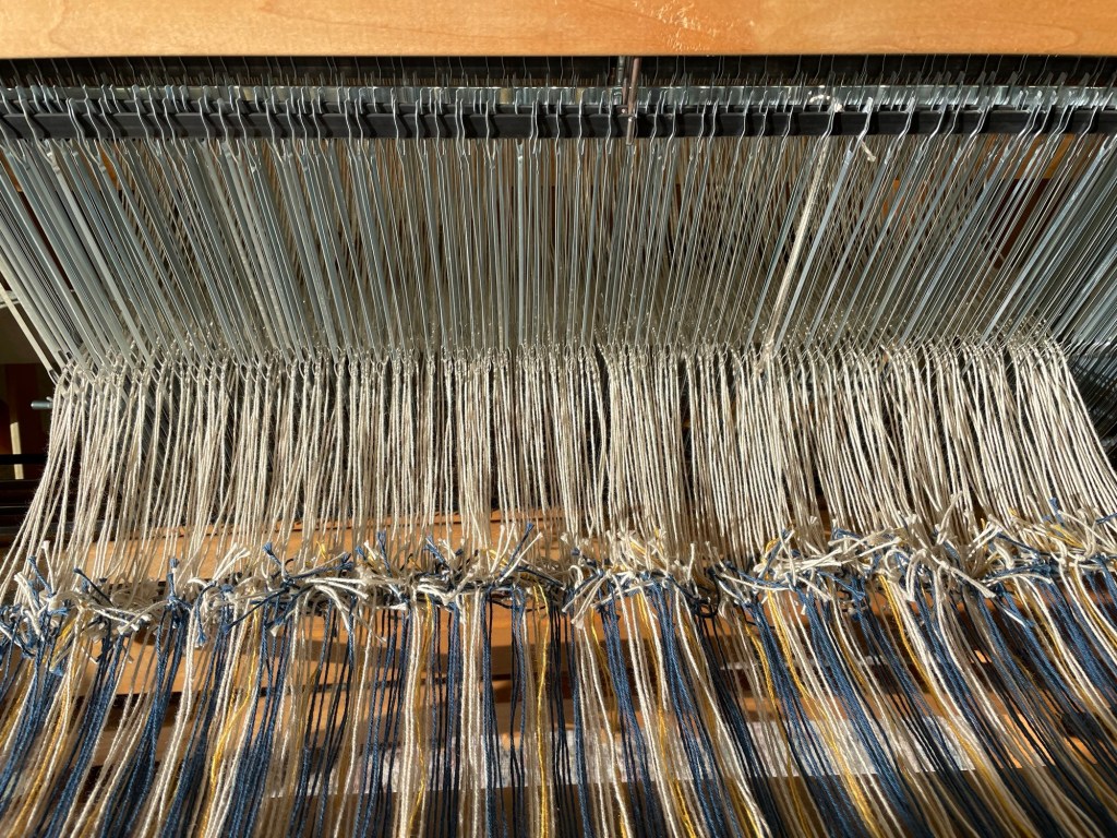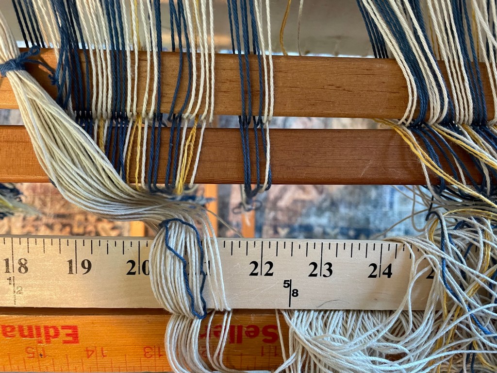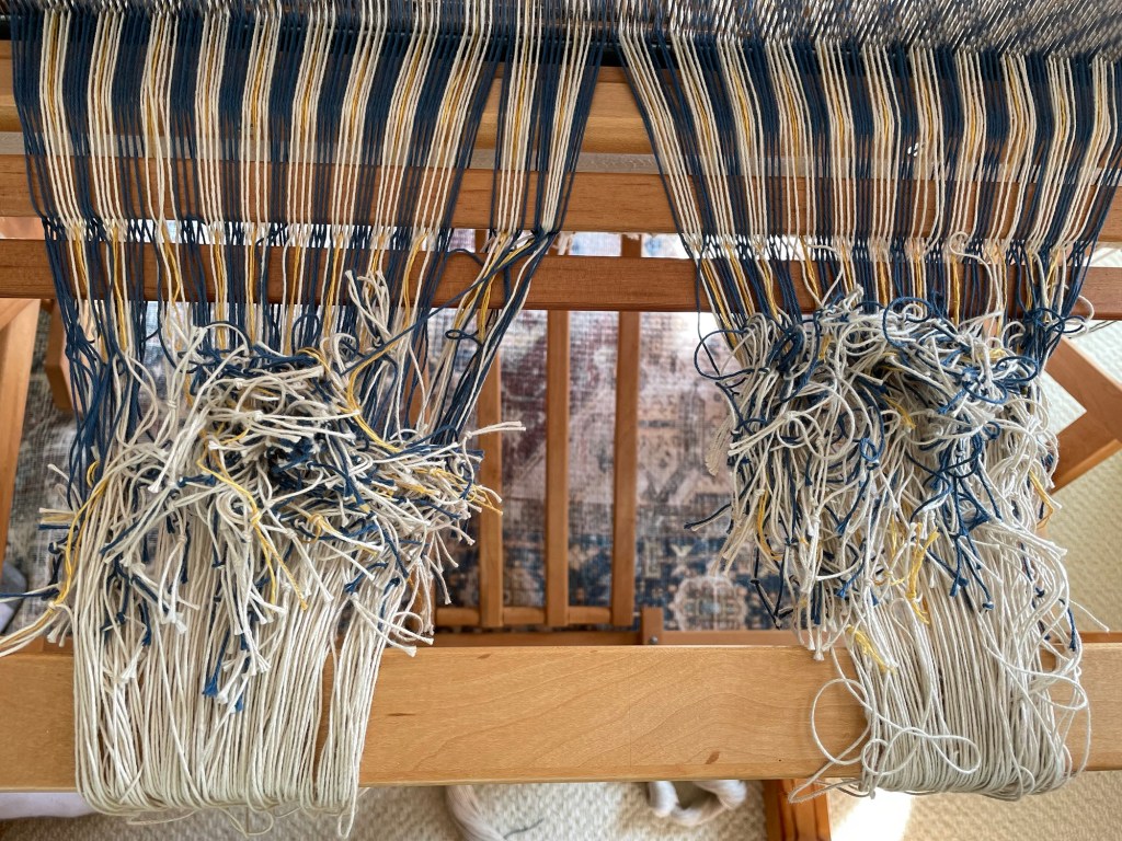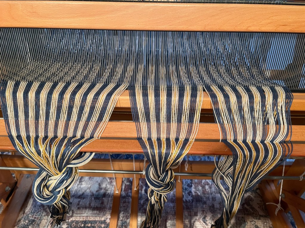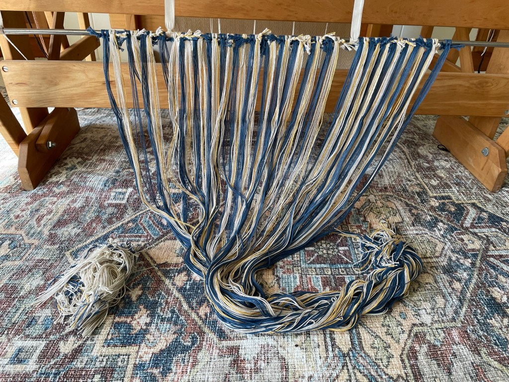 In the spring of 2024 after we got back from Arizona, I wove a set of dish towels on my floor loom (blog post with photos is here). When I was finished there was a lot of warp yarn left that I did not want to waste. I tied the yarn ends loosely so they would not get accidentally pulled out of the reed before I decided what to do with it. It sat there like that with many people and little children and dogs brushing past all summer.