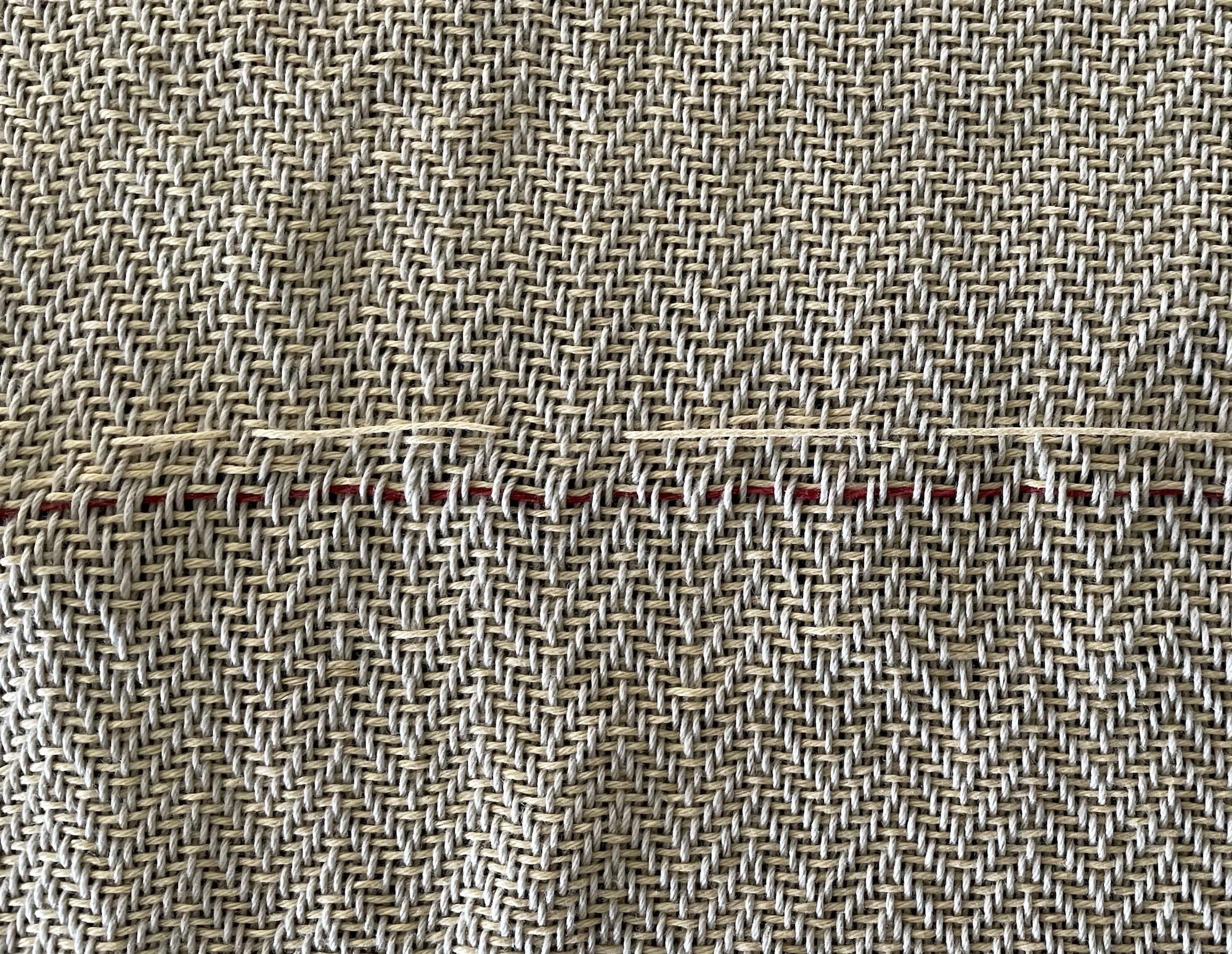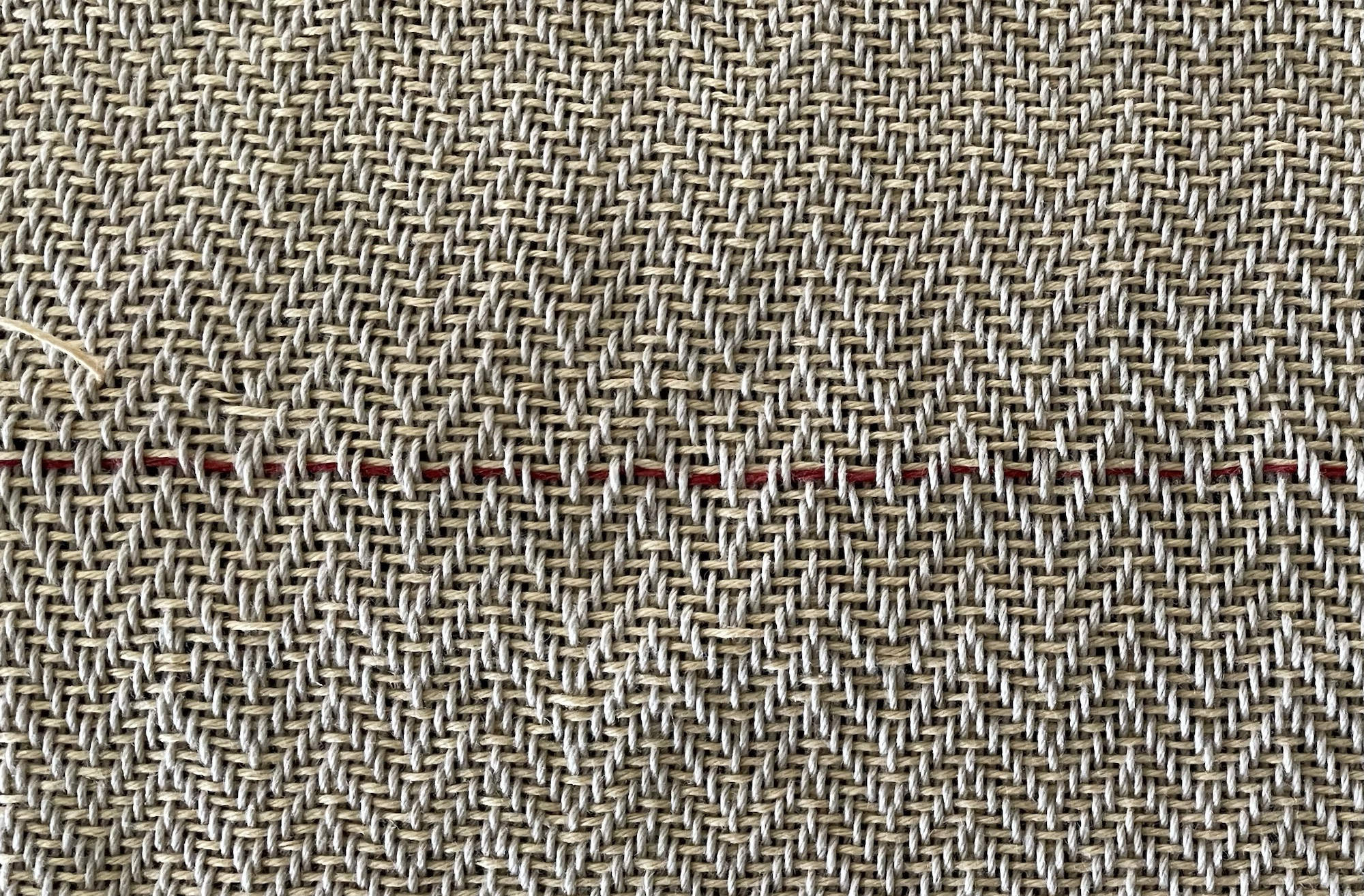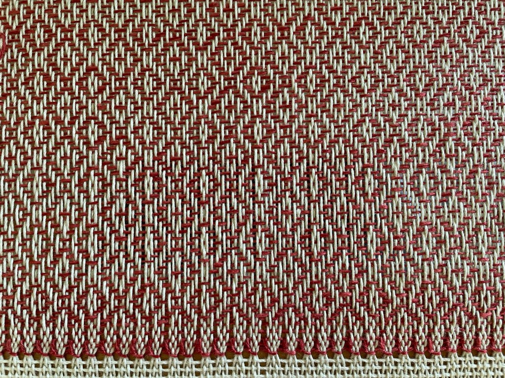 The next photo is the first towel in progress on the loom, using the pattern above, but with off white warp yarn, and red Gist Duet cotton/linen blend weft yarn.