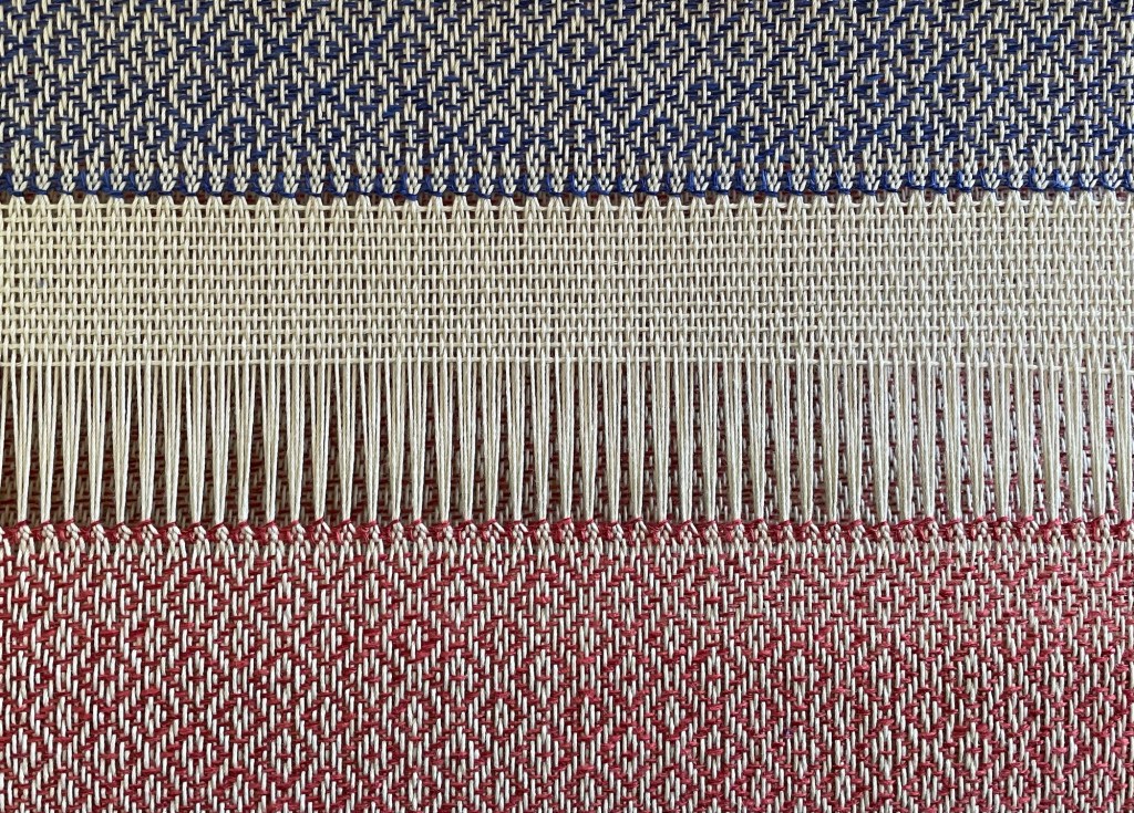 After finishing the red towel and weaving some spacer rows, I started the next towel using weft yarn of blue Gist Duet cotton/linen blend. The treadling pattern is slightly different. The area in between the two towels will become fringe.